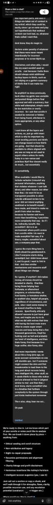 While i do want my identity, and anything potentially sensitive redacted, in any of the ways necessary, i also want to have a record of things, that is only found if needed, and maybe its never found, which is fine, but it should exist at least. And anything said can be redacted or you can take it out of circulation, or whatever you want to do, its not my call…